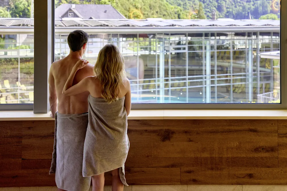 Freu dich auf ein Wellness-Erlebnis der Extraklasse. Auf mehr Raum, auf mehr Wohlfühlen. Auf zwei Etagen schafft die von Holz, Glas und Stein geprägte Architektur eine Erlebnis- und Gesundheitswelt in einer völlig neuen Dimension. Mit viel Platz im heilenden Thermalwasser mit abwechslungsreichen Wasserflächen innen wie außen, Ruhegalerie und Gastronomie. Mit einer Temperatur von 32° C speist das Thermalwasser die Vulkaneifel Therme. Es tritt aus über 2.000 Metern Tiefe an das Sonnenlicht, vollgesogen mit Wärme und Mineralstoffen, die es zur einzigen Glaubersalztherme Deutschlands machen. Dieses Geschenk des Vulkanismus gehört durch seine Naturwärme zu den besten Behandlungsmitteln der passiven wie aktiven Bewegungstherapie überhaupt. Eine Heilwirkung, die bereits die Römer zu schätzen wussten.
